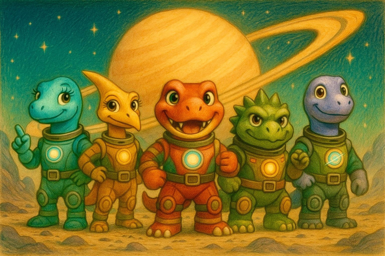 On the day a giant asteroid brought devastation to their world, five young dinosaurs evolved from their exposure to glowing meteorites. Rescued by the Galactic Rescue Force, these dinosaurs discover their new purpose - working together as CHOMPERNAUTS to help others in this Children's Space Adventure.